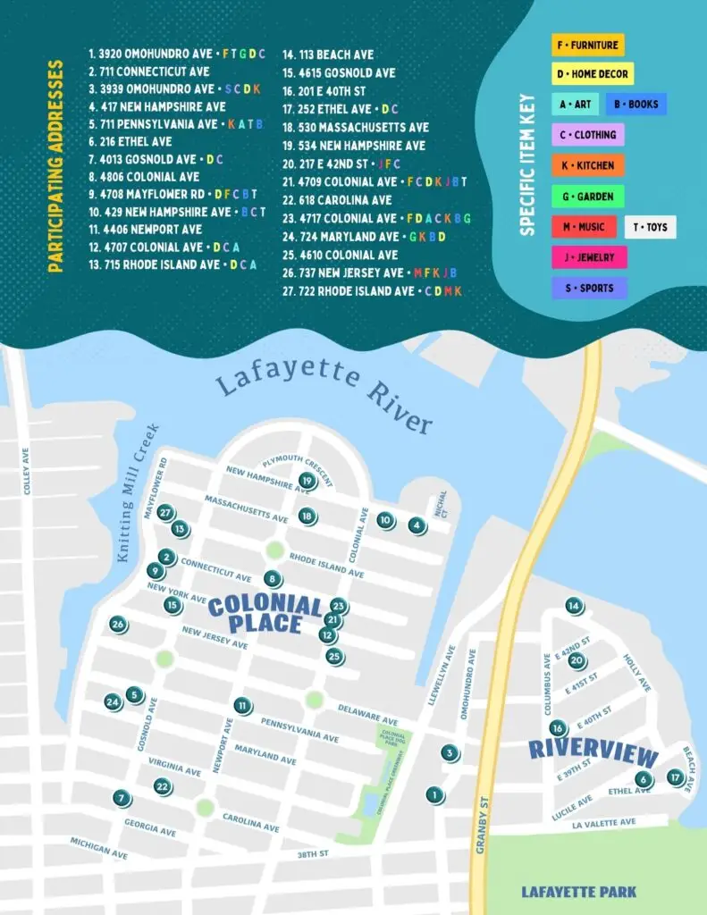 Shop from 27 yards across Colonial Place and Riverview featuring treasures of all kinds—furniture, home décor, electronics, clothes, shoes, art, toys, automotive items, and so much more.