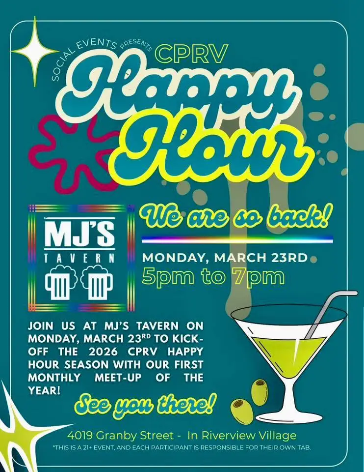 Kick off the 2026 CPRV Happy Hour season with us at MJ’s Tavern this Monday from 5 to 7 pm. It’s a relaxed way to connect with neighbors, meet new faces, and ease into the week with good conversation and a great local spot.