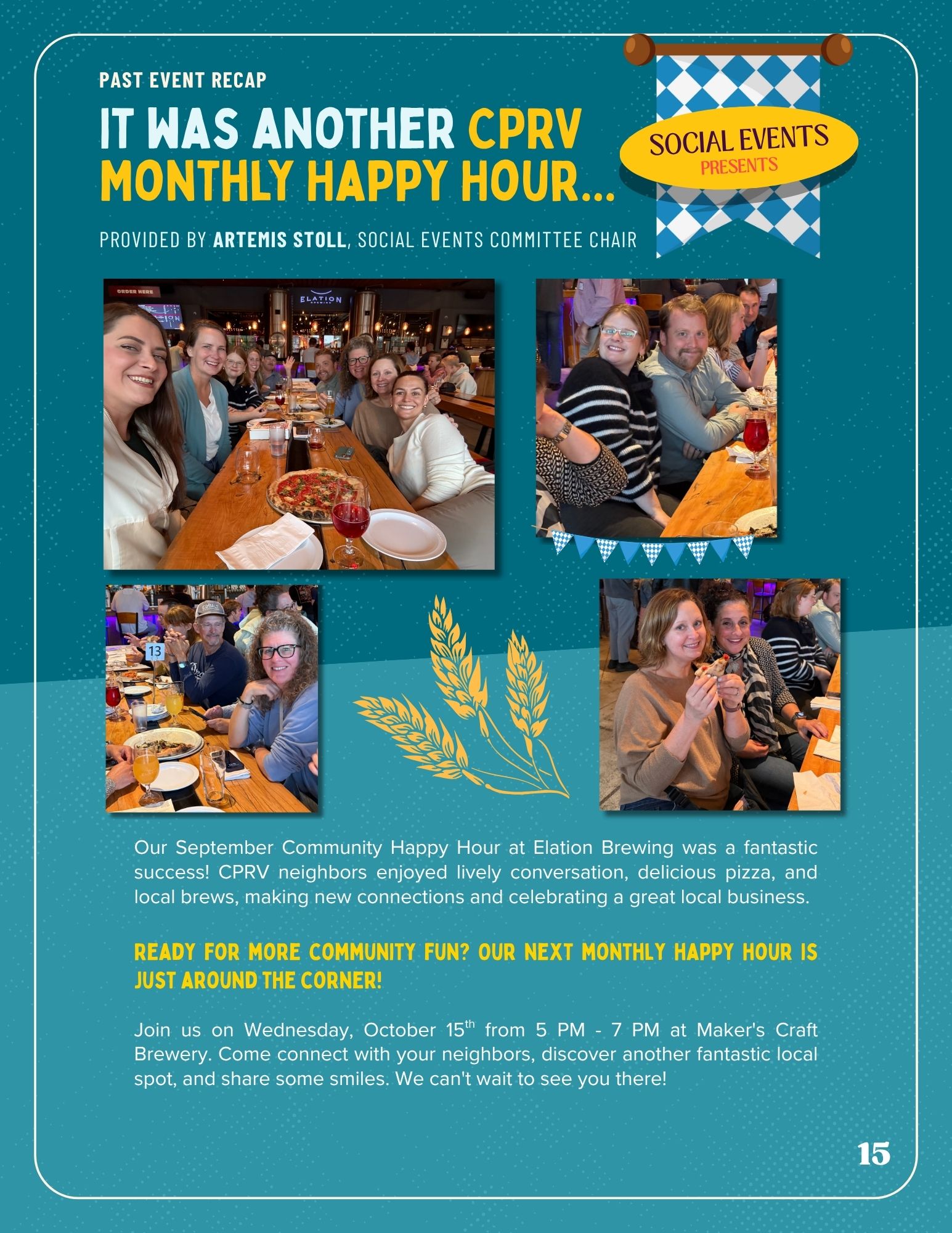 Our September Community Happy Hour at Elation Brewing was a fantastic success! CPRV neighbors enjoyed lively conversation, delicious pizza, and local brews, making new connections and celebrating a great local business.